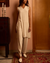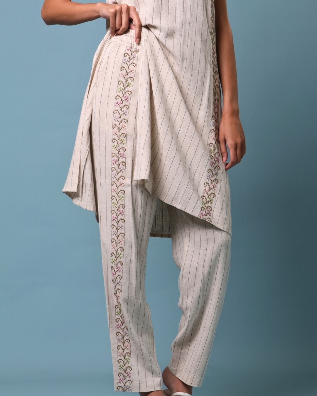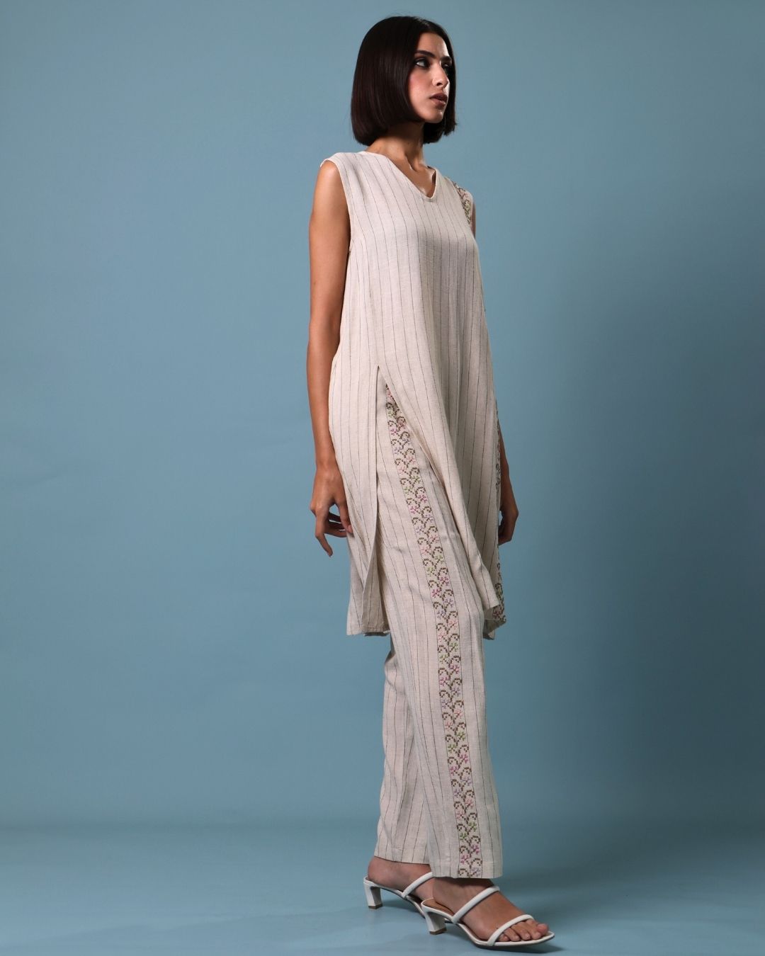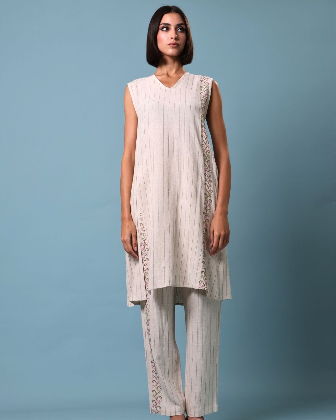 This refined set features a sleeveless V-neck long top paired with linen pants, both adorned with intricate corn embroidery representing various regions of Palestine.