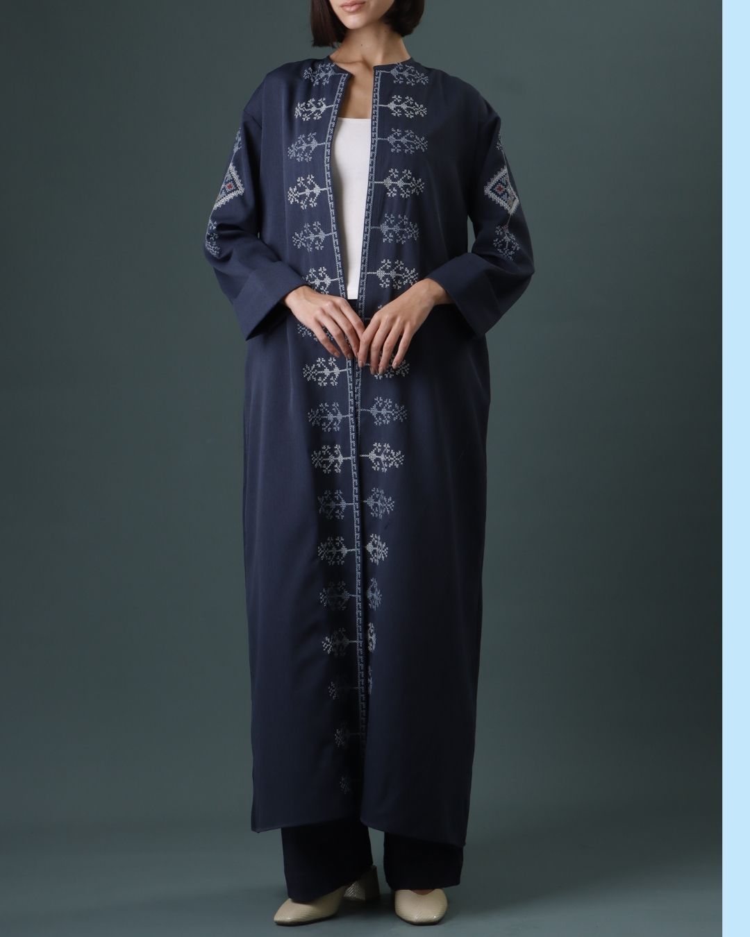 This sophisticated collarless abaya features a streamlined silhouette enhanced by intricate hand-embroidered detailing inspired by Khan Younes craftsmanship. Constructed from premium synthetic fabric, it delivers both durability and refined elegance for the discerning wearer.
