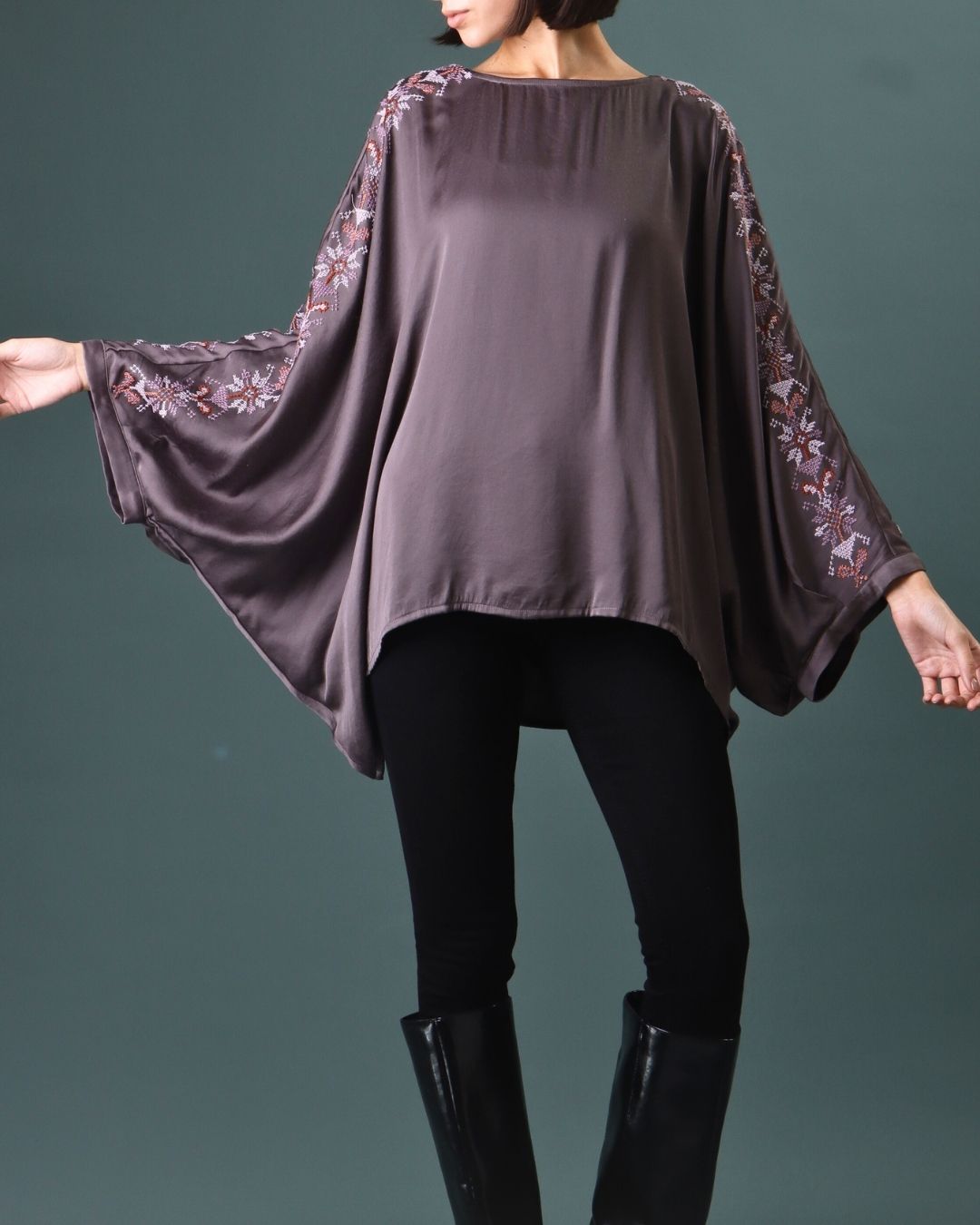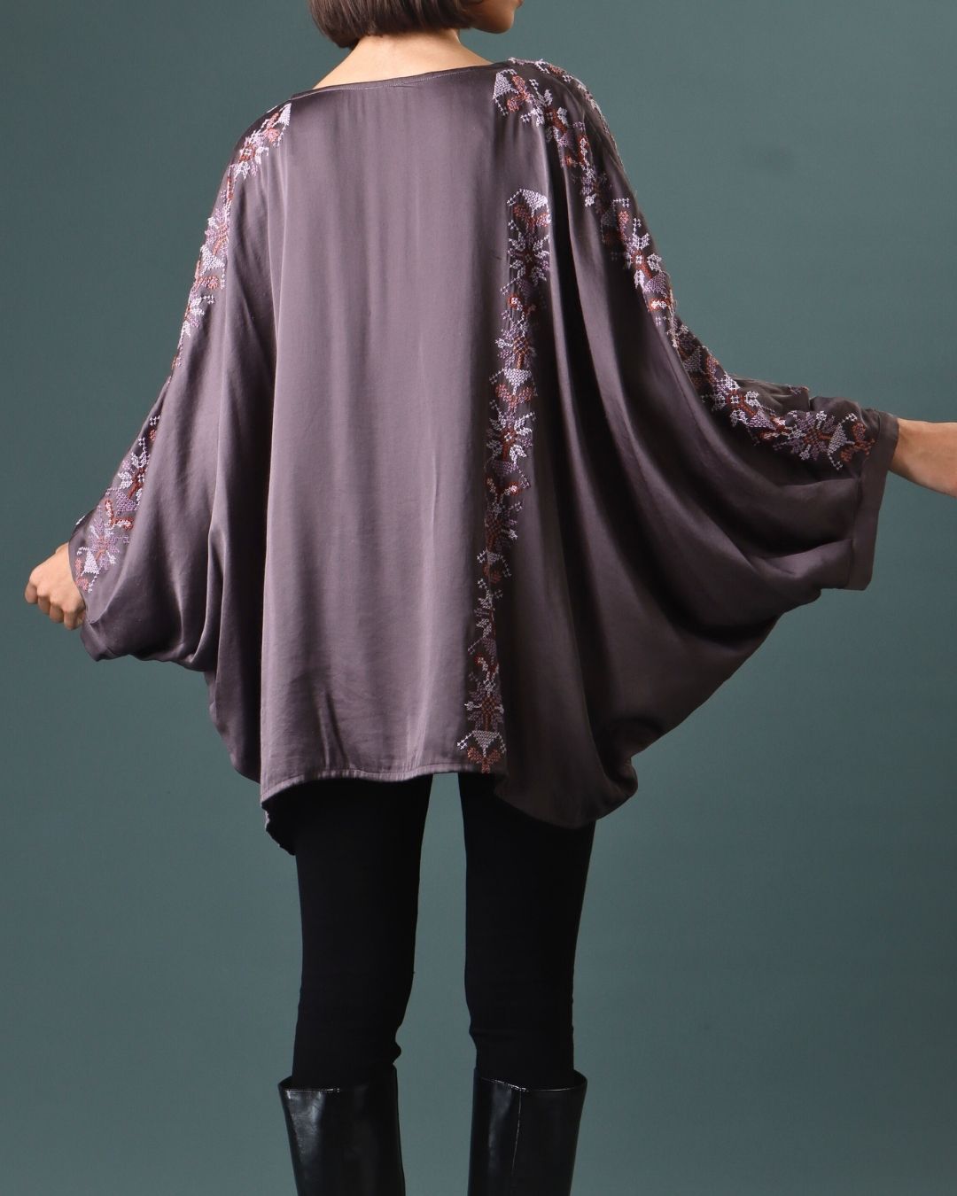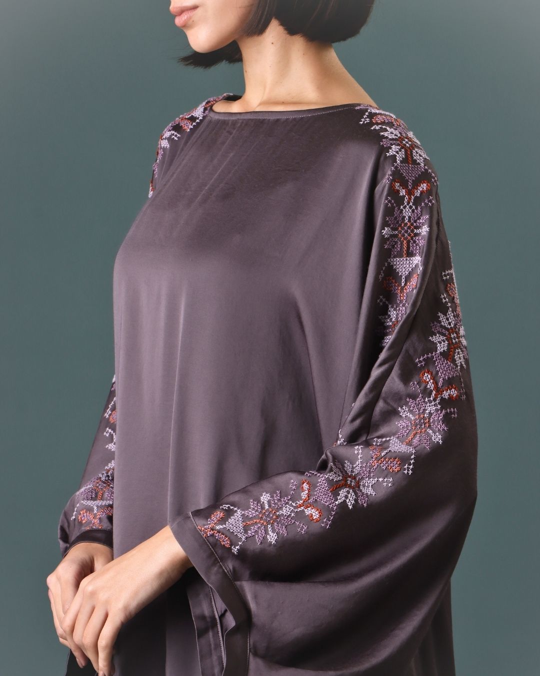 Experience refined elegance with this silk blouse, where traditional Palestinian embroidery meets contemporary design. Hand-stitched details draw inspiration from Ramallah's iconic floral pottery, while the crepe satin fabric and flowing cut create an effortlessly polished aesthetic. A sophisticated choice for those who appreciate authentic craftsmanship and cultural storytelling woven into their wardrobe.